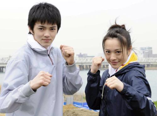 林遣都(17)と北乃きい(17)の主演映画「ラブファイト」(今秋公開、成島出監督)の撮影が2日、大阪市北区の淀川河川敷で行われた。俳優大沢たかお(40)の初プロデュース作品。ボクシングを通した青春ラブストーリーで、元日本チャンピオンの田端信之氏から指導を受けた林は「実は運動神経はあんまりだけど、ボクシングは楽しい」。同い年の北乃は「血液型も同じO型で気が合います。行動がかぶる時も」と息ぴったりの様子だった。