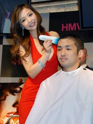 真っ赤なミニドレスのインリンが、志願した若い男性のモヒカン頭にバリカンを当てると、会場には劇中使用曲の「アベ・マリア」が。「すご~い。気持ちいい~」と喜ぶインリン。男性は産湯に漬かる赤子のような恍惚の表情を浮かべた。