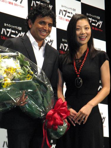 米映画「ハプニング」のM・ナイト・シャマラン監督に花束を手渡し笑顔の小池栄子