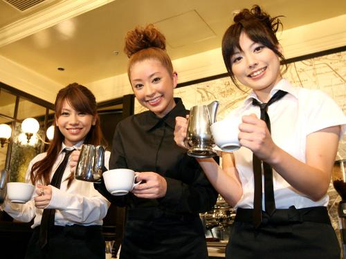 ラテアートに挑戦し笑顔を見せる(左から)青山学院大学ミスキャンパスの岩崎綾香さん、土岐田麗子、跡見学園女子大学ミスキャンパスの地洩杏理沙さん