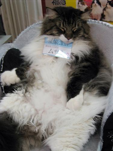 5匹の猫によるボーカルグループ「MUSASHI’S(ムサシーズ)」のリーダー、ムサシ(オス、5歳)が28日、東京・銀座の福家書店で1日店長を務めた。