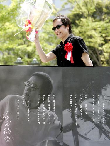 フォーク歌手の吉田拓郎(62)の名曲「今日までそして明日から」の歌碑が母校の広島修道大(広島市安佐南区)に建立され2日、除幕式が行われた。拓郎は昨年10月に体調を崩し全国ツアーを中止して以来、約10カ月ぶりの公の場。全国から駆けつけた熱烈なファン800人を前に「みんな元気でいてください」と笑顔で呼びかけた。