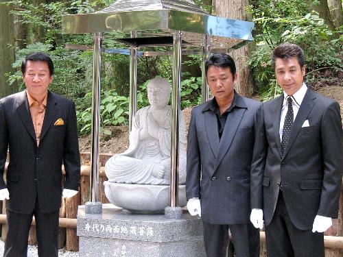 杉良太郎(63)は2日、山梨・大月市で新曲「矢立の杉」の歌碑の除幕式を行った。歌碑は同市の笹子峠にある矢立の杉の近くに建立され、杉は「生命をつかさどる中心の部分が(落雷のため)空洞化しているのに、甘皮だけで生きている。日本一というより世界一の杉。長生きさせてあげたい」と話した。矢立の杉にちなんだ舞台「闇の身代り地蔵」(大阪新歌舞伎座、10月3日~27日)もプロデュース。式典には同舞台に主演する山本譲二(58)と山川豊(49)も出席した。杉は「舞台の芝居の中で出てくる地蔵を置きたかった」と、歌碑の隣に身代わり地蔵を寄贈。