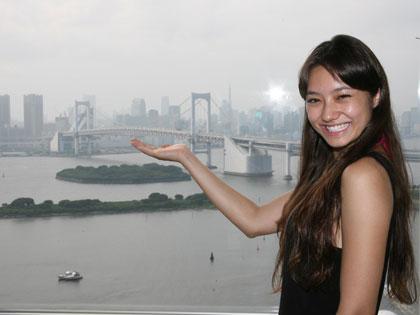 レインボーブリッチをバックに「空のF-1をここからレポート」と青山レイラ