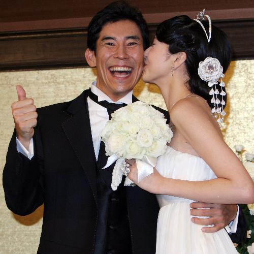 高嶋政伸夫妻が披露宴 新婦説得してチュ~