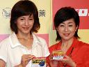 出演するCMの商品を手に笑顔の水野真紀(左)と竹下景子