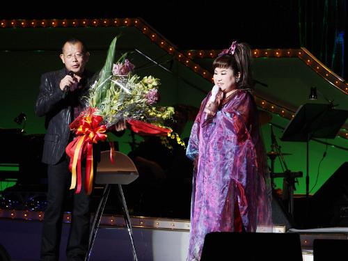 テレビ共演で親しくなったお笑いタレントの笑福亭鶴瓶(56)が応援に駆けつけ、花束をプレゼントされてびっくり。「この人の歌には心がある。いつまでも歌い続けてもらいたい」と声をかけられ、感激しきり。新曲「幸せはすぐそこに…」など23曲を歌った。