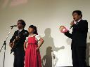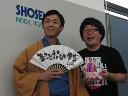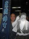 三波伸介さんのパネルの横に立ち喜ぶ三波伸一