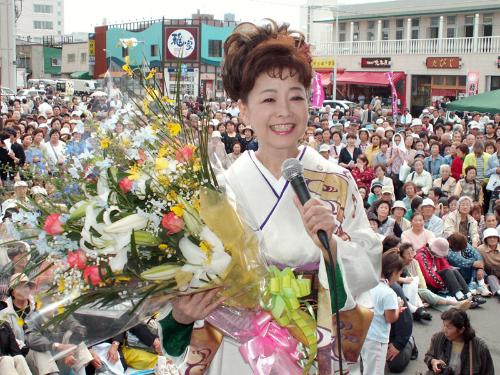 函館朝市の大駐車場で野外ライブを行った中村美律子