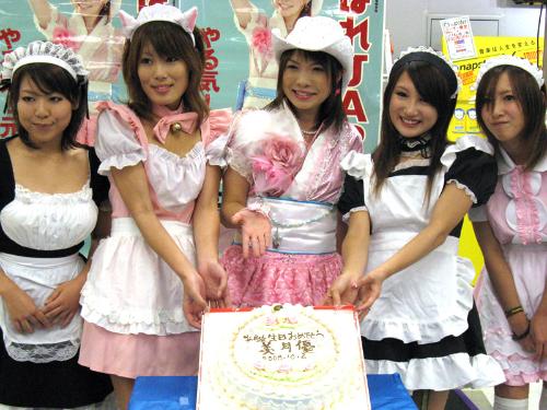 祝福に駆けつけたメードたちとバースデーケーキを前に笑顔の美月優