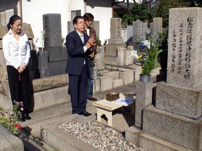 3日に無事幕が開いた報告とともに、千秋楽までの無事を祈念し焼香。西川は「一生懸命に頑張りますのでどうか見守っていてください」と、墓前にパンフレットを備え神妙な面持ちで手を合わせた。公演は26日まで。