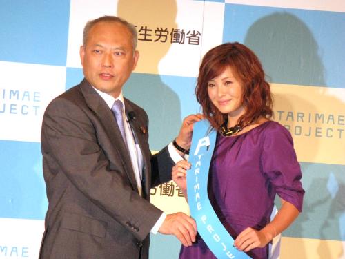 すっかりスケベおやじ!?松浦亜弥(右)にタスキをかけて、ご満悦な舛添要一厚生労働大臣