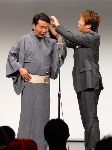 漫才コンビ「みよしとみよし」は舞台上で頭をいじるなど、さらけ出したネタを披露した(左)三善英史(右)元ちゃらんぽらんの富好真