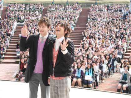 集まったファンの前で笑顔を見せる「WaT」のウエンツ瑛士(左)と小池徹平