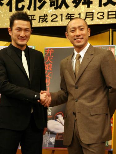 市川海老蔵(30)が座頭を務める新橋演舞場「初春花形歌舞伎」(09年1月3~27日)の製作発表が24日、都内で行われた。中村獅童(36)も出席した。