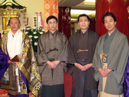 成功祈願を終え三好照生管主(しょうじょうかんす、左)と並ぶ(左から)市川染五郎、松本幸四郎、中村福助