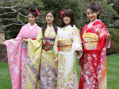 「全日本国民的美少女コンテスト」出身の10代の女優、福田沙紀(18)、林丹丹(19)、忽那汐里(15)、武井咲(14)の4人が、東京都内で来年正月に向けた晴れ着撮影会に出席し、あでやかな振り袖姿を披露した。