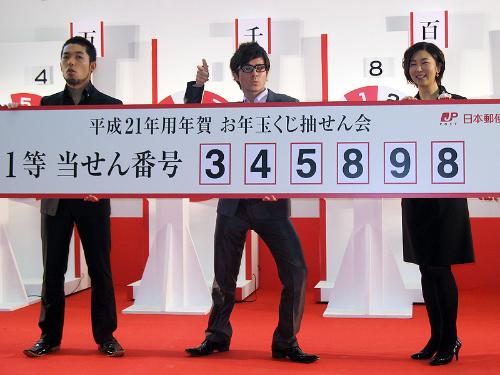 平成21年用年賀お年玉くじ抽せん会が25日、東京・お台場のアクアシティお台場で行われた。フリーアナウンサー中井美穂(43)、オリエンタルラジオの中田敦彦(26)と藤森慎吾(25)が参加。中井は日本郵便の「年賀状コンシェルジュ」として年賀状作りのガイドを務めた。藤森と中田は「芸人になって芸能人から年賀状をもらうようになった」と笑顔。引き換え期間は26日から7月27日まで。