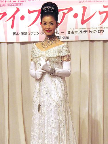 女優の大地真央(52)が27日、都内でミュージカル「マイ・フェア・レディ」(4月5日~5月1日、東京・帝国劇場)の製作発表会見を行った。日本では1963年初演で、4月28日の夜の部で日本上演通算1000回を迎え、90年からの大地の主演も4月9日の昼の部で550回に達する。「どの(出演)作品もわが子のようですが、これが一番といえる」と思い入れを語った。共演の石井一孝(41)は「真央さんは年々若返っている。普通の人類と違う」と感心していた。