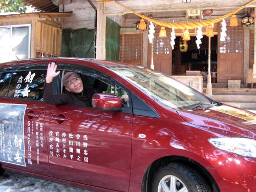 映画「劔岳 点の記」の木村大作監督(69)が28日、ロケ地の富山県立山町芦峅(あしくら)寺の雄山神社から、ポスターやキャスト名がプリントされた特製車「劔岳号」によるキャンペーンに出発した。