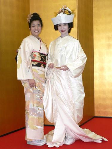 金屏風前で白無垢姿を披露した三倉佳奈(右)と、うらやましそうな三倉茉奈