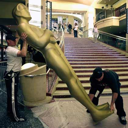 20日、米ロサンゼルスで開かれるアカデミー賞の授賞式の会場入り口にオスカー像を設置する作業員
