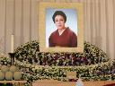 ≪祭壇 7種の紫の花で飾られる≫えび茶色の着物姿でほほ笑む遺影が置かれた祭壇は、藤間さんの名前にちなみ、スイートピー、バラ、カーネーションなど7種の紫の花で飾られた。遺影は13年前に宣伝用に撮影された1枚で、本人が気に入っていたものだという。棺の中には4月28日にNHKホールで出演予定だった公演用の着物など舞踊関係の品のほか、猿之助が色紙に書いたヤマトタケルの絵なども納められた。