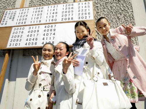 宝塚音楽学校(兵庫県宝塚市)で30日、第97期生の合格発表があり、約28倍の難関を突破した15~18歳の少女40人が、あこがれの舞台への第一歩を踏み出した。雪組の娘役だった筑紫野あやさんの長女高倉あやさん(15)=福岡市=は「受からないと思っていたので目を疑った。観客に夢を与えられる舞台人になりたい」と感極まった様子。今回から1次試験で実技を取りやめ面接のみにするなど入試内容を変更。その効果もあって、受験者数は昨年より252人多い1106人だった。合格者は宝塚歌劇団への入団を目指し、2年間、歌やバレエなどのレッスンに取り組む。