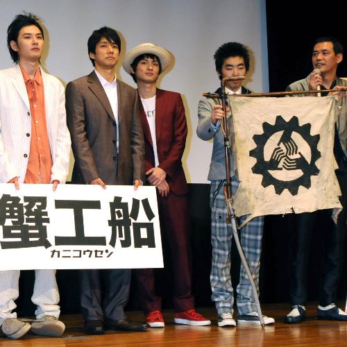 小林多喜二の同名小説を基にした映画「蟹工船」の完成報告会見が10日、都内で行われた。カニの缶詰を製造する漁船で過酷な仕事を強いられる労働者が、資本家に立ち向かう物語。オリジナルの発表から79年を経た昨年、ブームが再燃。流行語大賞トップ10にも選ばれた。労働者役で主演した松田龍平(25)は「あえて原作は読まずに演じた」と話し、SABU監督(44)の世界観を大事にしたようだ。“派遣切り”など労働者に厳しい風が吹いているが「蟹工船には現場監督という憎むべき敵がいた。いまの不況はそういう対象が見えにくく、つらいと思う」と話した。今夏公開。