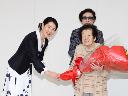 小百合が花束贈呈 吉田記念館来館者50万人突破