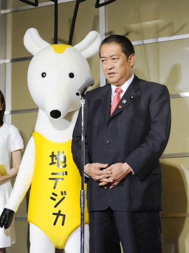 新キャラクター「地デジカ」の横で、SMAPの草なぎについて話す鳩山総務相