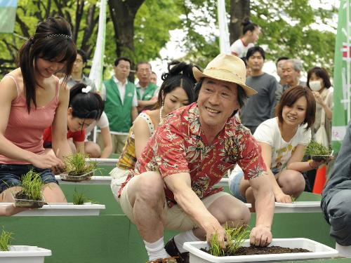 東京・渋谷の公園通りでプランターを使ったコメ作りが4日、始まった。近くの代々木公園でイベントがあり、俳優の武田鉄矢がアロハシャツに短パン姿で苗を植え込んだ。