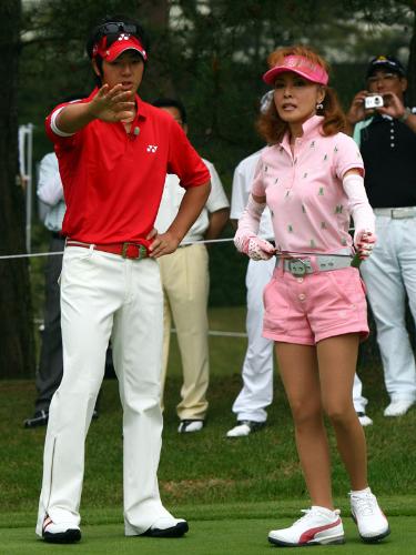 ラウンド前、小柳ルミ子(右)にパターの特別レッスンをする石川遼