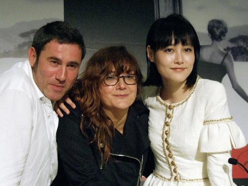 カンヌ国際映画祭会場での記者会見で、ポーズをとる菊地凛子(右)とイザベル・コイシェ監督(中)ら