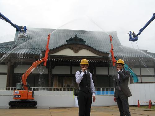 裕次郎さんは雨男と呼ばれ、区切りの法要は必ず雨。そこで、この日は4台の重機を使用し、10分間で20トン放水する防水テストも行った。気象庁では滝のような雨を指す1時間に50~80ミリの雨を「非常に激しい雨」としているが、石原プロの小林正彦専務は「1000ミリ以上の雨でも(防水、強度ともに)大丈夫」と太鼓判を押した。