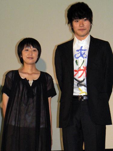 俳優の松山ケンイチ(24)が主演した映画「ウルトラミラクルラブストーリー」(監督横浜聡子)の大ヒット御礼舞台あいさつが20日、都内で行われた。スプレーで「ありがとう」の文字を書いたワイシャツを着て登壇。地元の青森県が舞台の作品で「僕の中でもの凄く特別な作品」と笑顔。抽選会も行われ、松山が劇中で刈った青森産の米をプレゼントしファンをわかせた。また、この日、蒼井優(23)が吹き替えを担当した映画「いけちゃんとぼく」などが封切られた。