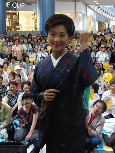 演歌歌手の長山洋子(41)が27日、新曲「瀬戸の晩夏」(10日リリース)発売記念キャンペーンを堺市内で開いた。2000人が足を止める中、3曲で民謡仕込みの美声を披露。大きな拍手を受けるなど新曲への反響は上々で「ママさんになる予定がないくらい忙しい」と、4月に結婚した米国人社長マーク・スミス氏とのアツアツ生活もそこそこに、仕事モード全開。デビュー25周年の今年はアイドル時代の作品にも光をあてる方向で秋には限定CDボックスを発売する。「ライブでもぜひ歌いたい。そのときはマイクロミニスカートをはいちゃいます!」と気合を見せていた。