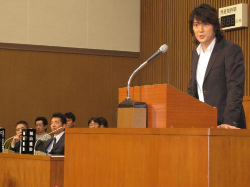 市議会議場で会見する福山雅治