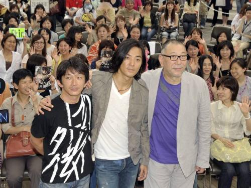 映画「カムイ外伝」トークショーでファンと記念写真を撮る(左から)アクション監督の谷垣健治氏、イーキン・チェン、崔洋一監督