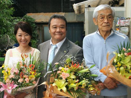 「釣りバカ日誌20 ファイナル」の撮影を終え、花束を贈られた(左から)浅田美代子、西田敏行、三国連太郎