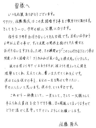 ワタクシ、佐藤隆太はこの度結婚する事をご報告させていただきます。そしてもう一つ、今年の秋に父親になります。