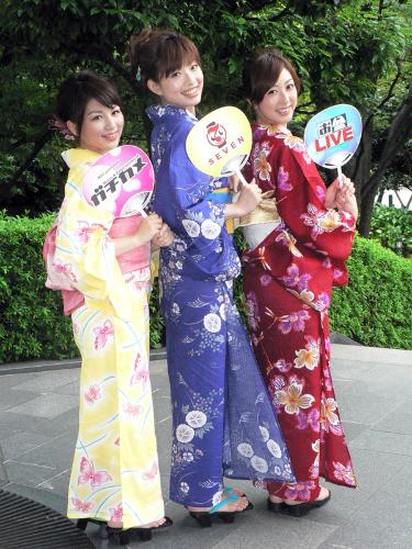 浴衣を着て「ガチカメ(7)お盆ライブ」をPRする(左から)吉田奈央アナ、林マオアナ、川田裕美アナ