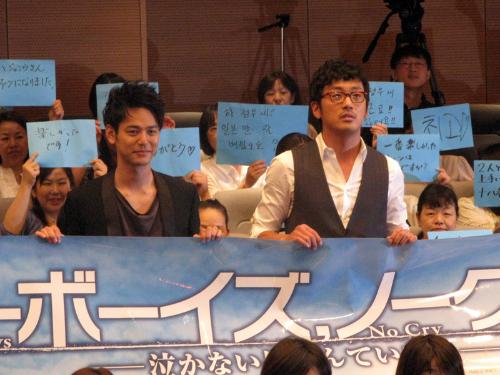 妻夫木聡(28)と韓国俳優ハ・ジョンウ(31)が主演した日韓合作映画「ノーボーイズ、ノークライ」(監督キム・ヨンナム、22日公開)のプレミア試写会が2日、都内で開かれた。