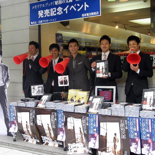 販売記念イベントとして、石原プロモーションの徳重聡(31)ら5人の若手俳優が東京・日本橋の丸善と銀座の福家書店の店頭で計250部を実際に販売。メガホンを持って「きょうから発売されました!」と呼び掛けた。裕次郎さんの秘蔵写真のほか、二十三回忌当日の模様も加えた貴重な1冊。徳重は「暑い中、たくさんの方に来ていただいてありがたいです」と感謝した。