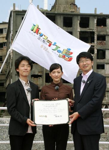アニメ映画「ホッタラケの島~遥と魔法の鏡~」に登場する架空の島と、長崎市沖の軍艦島(正式名・端島)の“姉妹島”認定式が17日、軍艦島であった。22日から東宝系で全国公開される映画のPRイベントで、声優を務めた女優の綾瀬はるかや佐藤信介監督、田上富久長崎市長らが出席した。