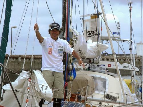 フランス北西部ルアーブルにヨットで到着した間寛平(間寛平アースマラソン製作委員会)