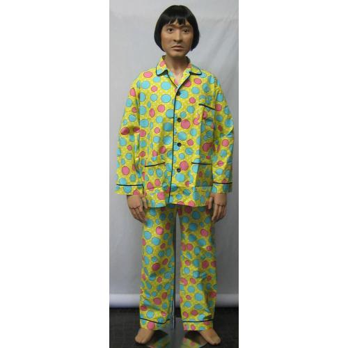 「しんぼるMAN」と命名された像は驚くほどそっくり!素材は合成樹脂で、水玉模様のパジャマも身に着け、本人が立っているかのようだ。