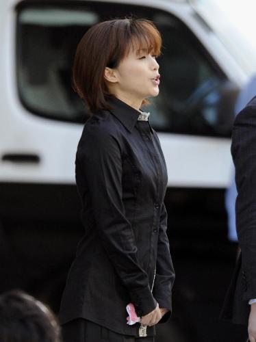 湾岸署を出た際の酒井法子被告(38)は上下黒のパンツスーツ姿だったが、会見時には服装を替えた。夫の高相祐一被告(41)とおそろいの左手薬指のタトゥーはファンデーションで消していた。