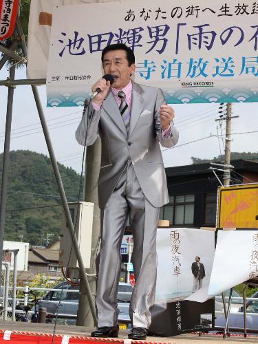 演歌歌手・池田輝男(56)が22日、新潟・長岡市寺泊を訪れ、北浜公園内特設ステージで「池田輝男『雨の夜汽車』寺泊放送局」と銘打った新曲イベントを行い、第2弾シングル「雨の夜汽車」(詞・峰崎林二郎、曲・水森英夫、発売・キングレコード)と「寺泊」の町のPRした。