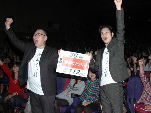 観客とともに、さらなるヒットに向けて気勢を上げる「カムイ外伝」の崔監督(左)と松山